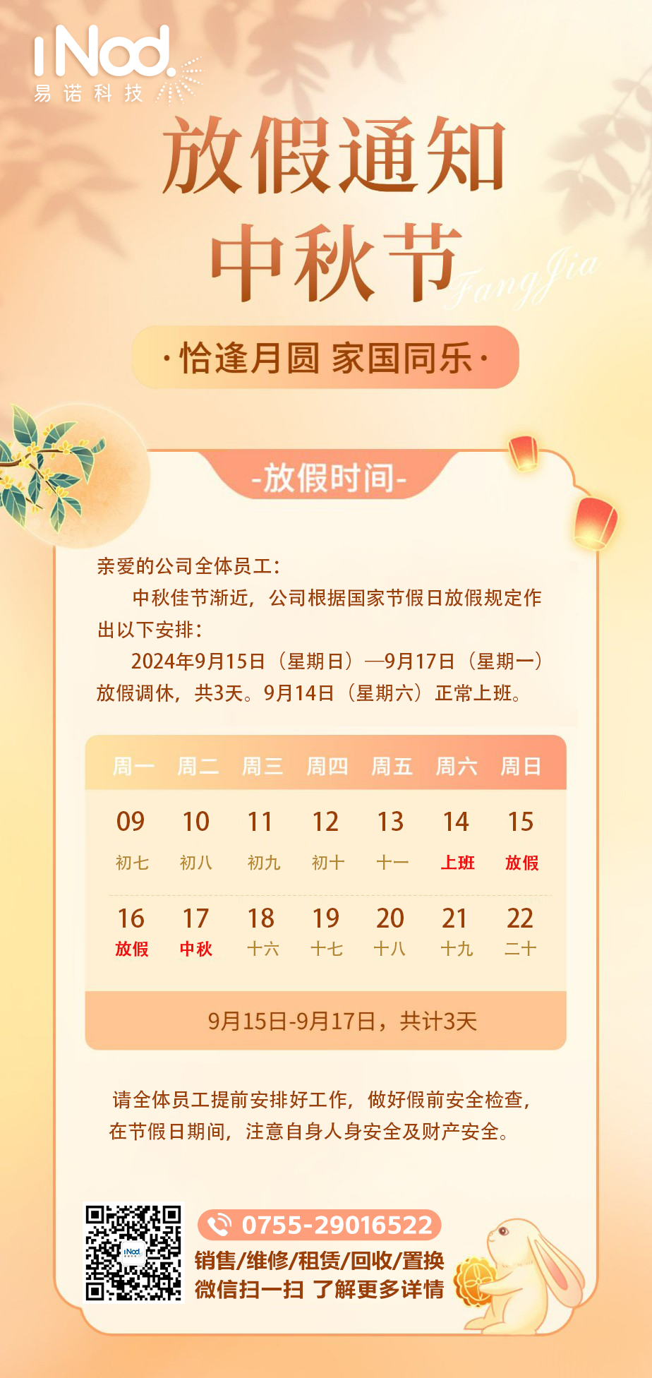 易諾科技中秋放假調休通知