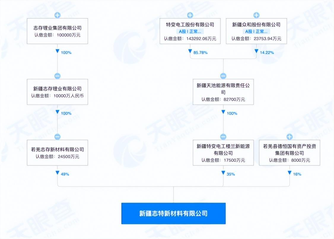 據天眼查顯示,新疆志特新材料有限公司成立于2022年11月7日,若羌志存新材料有限公司持股49%,新疆特變電工樓蘭新能源有限公司持股35%,若羌縣德恒國有資產投資集團有限公司持股16%。