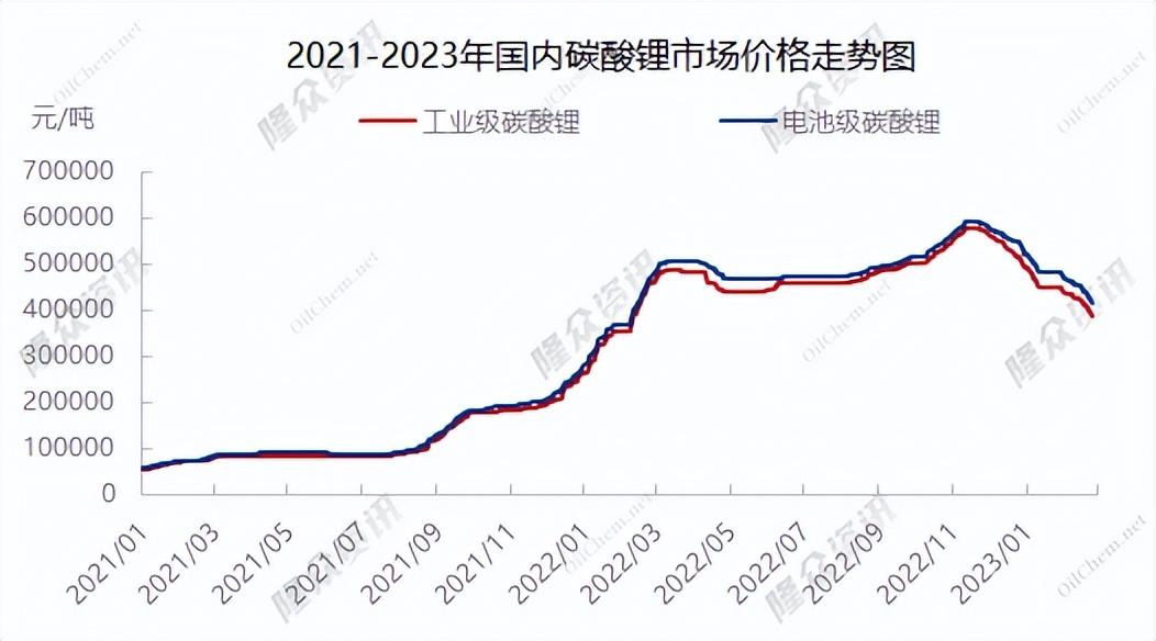 據上海鋼聯數據顯示,2月23日,電池級碳酸鋰跌7500元/噸,均價報41.5萬元/噸;工業級碳酸鋰跌10000元/噸,均價報38.5萬元/噸。其中,電池級碳酸鋰當前報價相比2022年11月每噸60萬元的高點,跌幅超過30%。