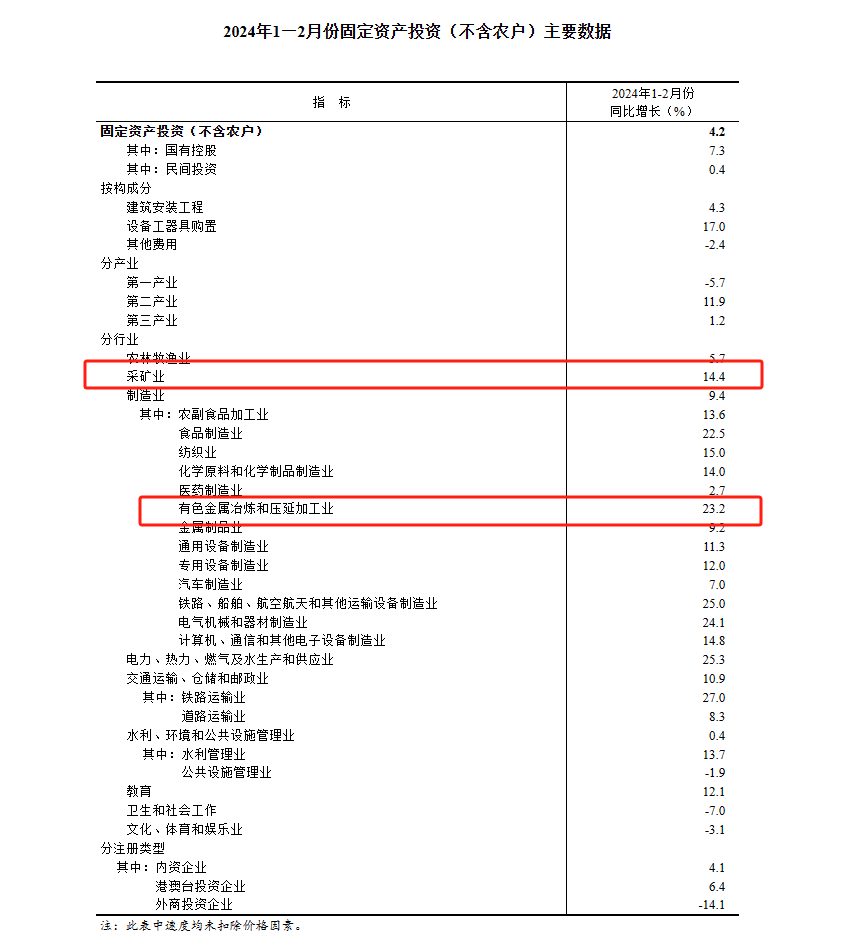 分行業看,1—2月份,41個大類行業中有39個行業增加值保持同比增長。其中,涉礦主要行業利潤情況如下:煤炭開采和洗選業增長1.4%,石油和天然氣開采業增長3.0%,金屬礦物制品業增長3.9%,黑色金屬冶煉和壓延加工業增長8.7%,有色金屬冶煉和壓延加工業增長12.5%。
