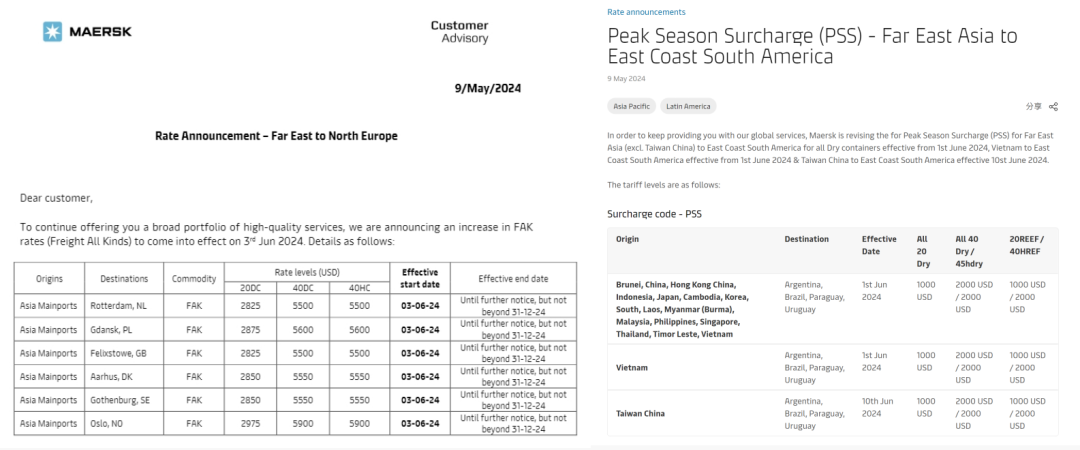 船公司們宣布新一輪運價調(diào)整計劃,馬士基和達飛兩大航運巨頭已宣布6月再提價計劃,上調(diào)北歐FAK費率。其中,馬士基每40尺柜最高5900美元,達飛再次上調(diào)1000美元,每40尺柜6000美元。赫伯羅特、HMM等船公司繼續(xù)調(diào)整部分航線的費率,涉及歐地、非洲、南美、北美等。5月上旬美線(運價)已經(jīng)連漲了兩次,每次各漲了1000美元左右,漲價還將繼續(xù),并將在5月下旬飆升到5000美元以上。