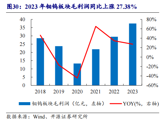 鉬鎢板塊方面,開源證券研報顯示,去年,洛陽鉬業(yè)全年鉬鎢產量合計2.36萬噸,營收為86.11億元,同比增長23.63%,毛利為37.51億元,創(chuàng)歷史最高紀錄。