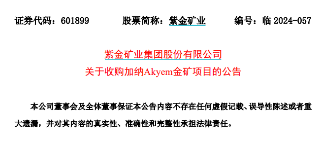 2024年10月9日,紫金礦業(yè)宣布擬出資10億美元(約70.71億人民幣)收購紐蒙特全資子公司Newmont Golden Ridge Ltd的100%股權(quán),拿下加納Akyem金礦項目的全部權(quán)益。這是紫金礦業(yè)自2020年以來的第7宗金礦并購,標(biāo)志著公司在全球金礦布局的持續(xù)加強。Akyem金礦擁有黃金資源量54.4噸,儲量約34.6噸,年均產(chǎn)金約5.8噸。