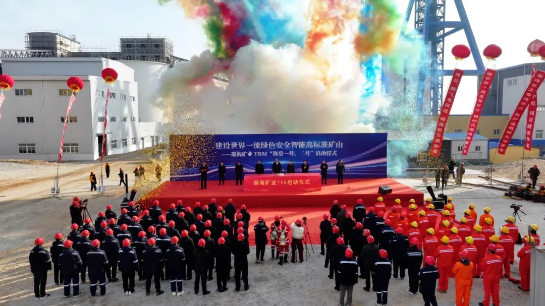 2024年12月30日上午9時36分,瑞海礦業(yè)有限公司副井井塔前嘉賓齊聚、彩球飄飄、旌旗獵獵,十二條巨幅標語迎風招展,兩臺TBM(全斷面硬巖隧道掘進機)啟動儀式揭幕,瑞海礦業(yè)總經(jīng)理于明海、浙江省隧道工程集團公司副董事長黃德祥、山東招金礦業(yè)股份有限公司董事長姜桂鵬先后作了發(fā)言和致辭。上午10時,隨著萊州市政府副市長邱召明宣布“萊州市瑞海礦業(yè)有限公司‘海岳一號、海岳二號’TBM發(fā)車”,萊州市政府副市長邱召明,招遠市政府副市長荊興業(yè),山東招金集團有限公司副董事長、總經(jīng)理王樂譯,招金礦業(yè)董事長姜桂鵬等嘉賓共同按下啟動球。