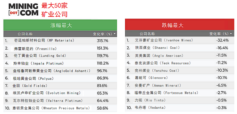 不出所料,漲幅最高的榜單中貴金屬股占據(jù)主導(dǎo)地位,最新躋身50強的礦業(yè)公司大多數(shù)為貴金屬企業(yè)。