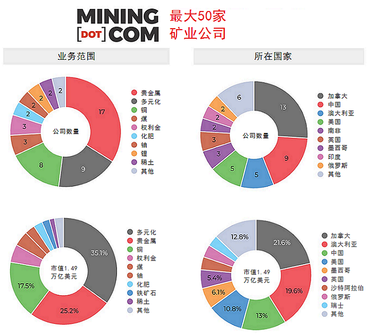 目前50家最大礦企中,總部設(shè)在加拿大的礦企有13家,總市值為3200億美元,占50強總市值的22%。總部設(shè)在澳大利亞的礦企有5家,總市值為2930億美元,其中來自悉尼的埃沃盧申礦業(yè)公司(Evolution Mining)今年首次進(jìn)入。