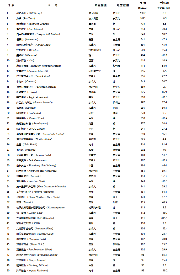 據(jù)Mining.com網(wǎng)站梳理統(tǒng)計,截止到二季度末,世界最大50家礦企總市值接近1.5萬億美元,2025年以來已經(jīng)增長了2130億美元。