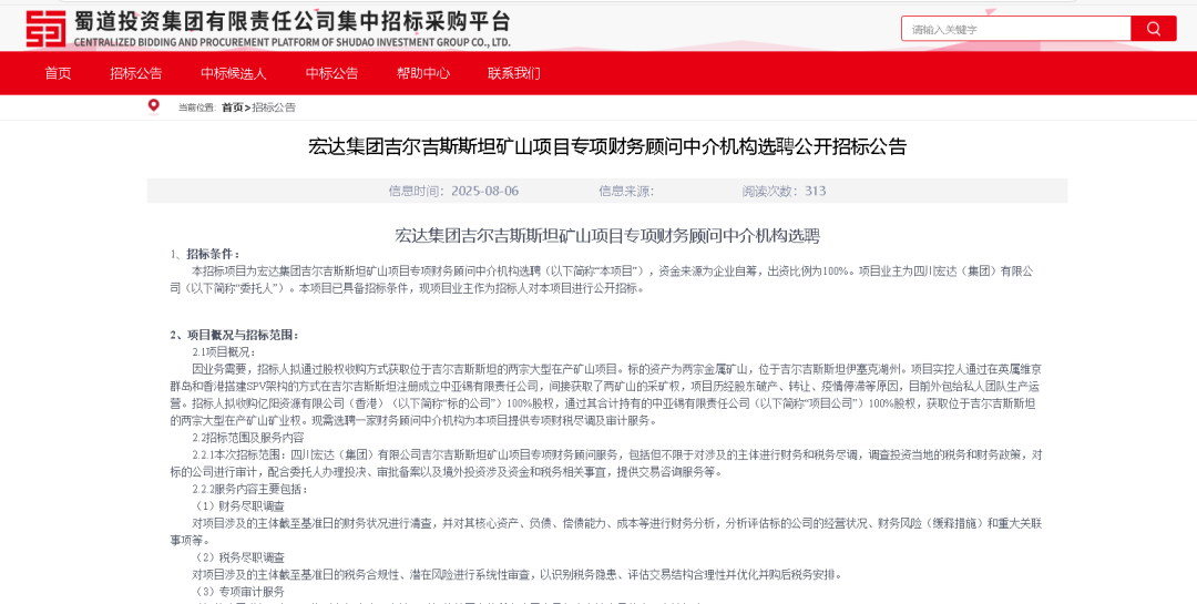 消息源于蜀道投資集團(tuán)集中招標(biāo)采購(gòu)平臺(tái)發(fā)布的《宏達(dá)集團(tuán)吉爾吉斯斯坦礦山項(xiàng)目專項(xiàng)財(cái)務(wù)顧問(wèn)中介機(jī)構(gòu)選聘公開(kāi)招標(biāo)公告》。公告顯示,宏達(dá)集團(tuán)計(jì)劃收購(gòu)億陽(yáng)資源有限公司 (香港) 100% 股權(quán),通過(guò)這一操作,將間接掌控中亞錫有限責(zé)任公司100% 股權(quán),進(jìn)而獲取位于吉爾吉斯斯坦伊塞克湖州的兩宗大型在產(chǎn)礦山礦業(yè)權(quán)。為順利推進(jìn)收購(gòu),宏達(dá)集團(tuán)正在公開(kāi)選聘一家財(cái)務(wù)顧問(wèn)中介機(jī)構(gòu),為項(xiàng)目提供專項(xiàng)財(cái)稅盡調(diào)及審計(jì)服務(wù),項(xiàng)目資金全部來(lái)源于企業(yè)自籌。