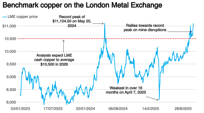業(yè)內(nèi)30位分析師的預(yù)測中值顯示,2026年LME現(xiàn)貨銅均價料為10500美元/噸,較7月份上次調(diào)查的9796美元預(yù)測上調(diào)了7.2%。