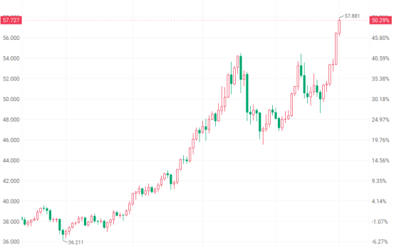 白銀市場表現(xiàn)強勁,Wind數(shù)據(jù)顯示,12月1日,國際銀價一度突破57美元/盎司關(guān)口,再創(chuàng)新高;COMEX白銀首次突破58美元/盎司;滬銀主力合約盤中最高漲超7%,達13520元/千克,創(chuàng)下新高。今年以來,國際銀價已上漲超90%,大幅跑贏黃金。